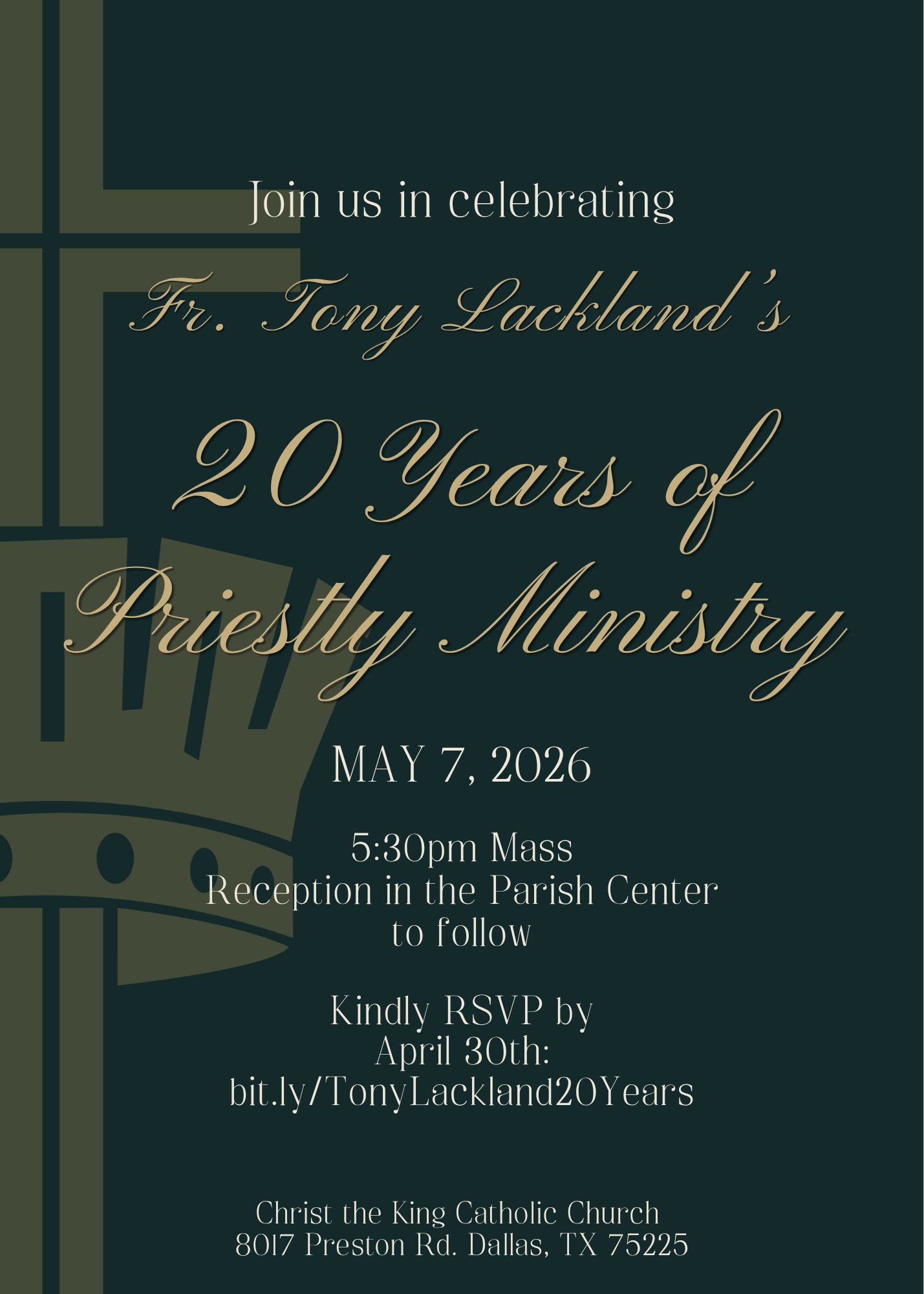 The evening on Thursday, May 7, 2026, will begin with Mass at 5:30 pm, celebrated by Fr. Tony at Christ the King Catholic Church. A reception will follow in the Parish Center.