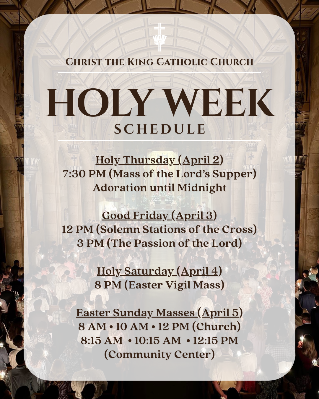 The 2026 Holy Week Schedule at Christ the King is as follows: