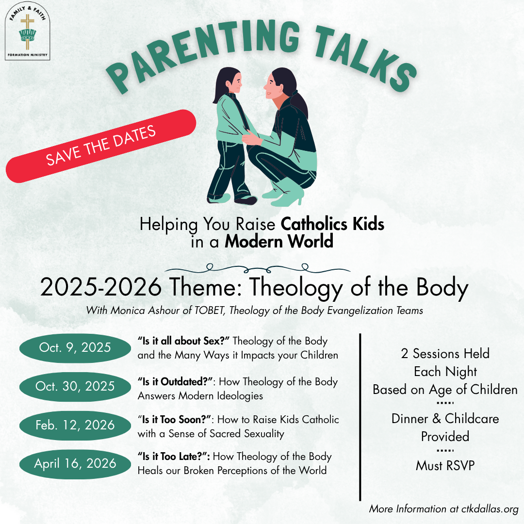 Theme: This year, our 4-part Parenting Talk Series is on Theology of the Body. These talks will help you understand how to teach Theology of the Body related topics to your children, based on their age.